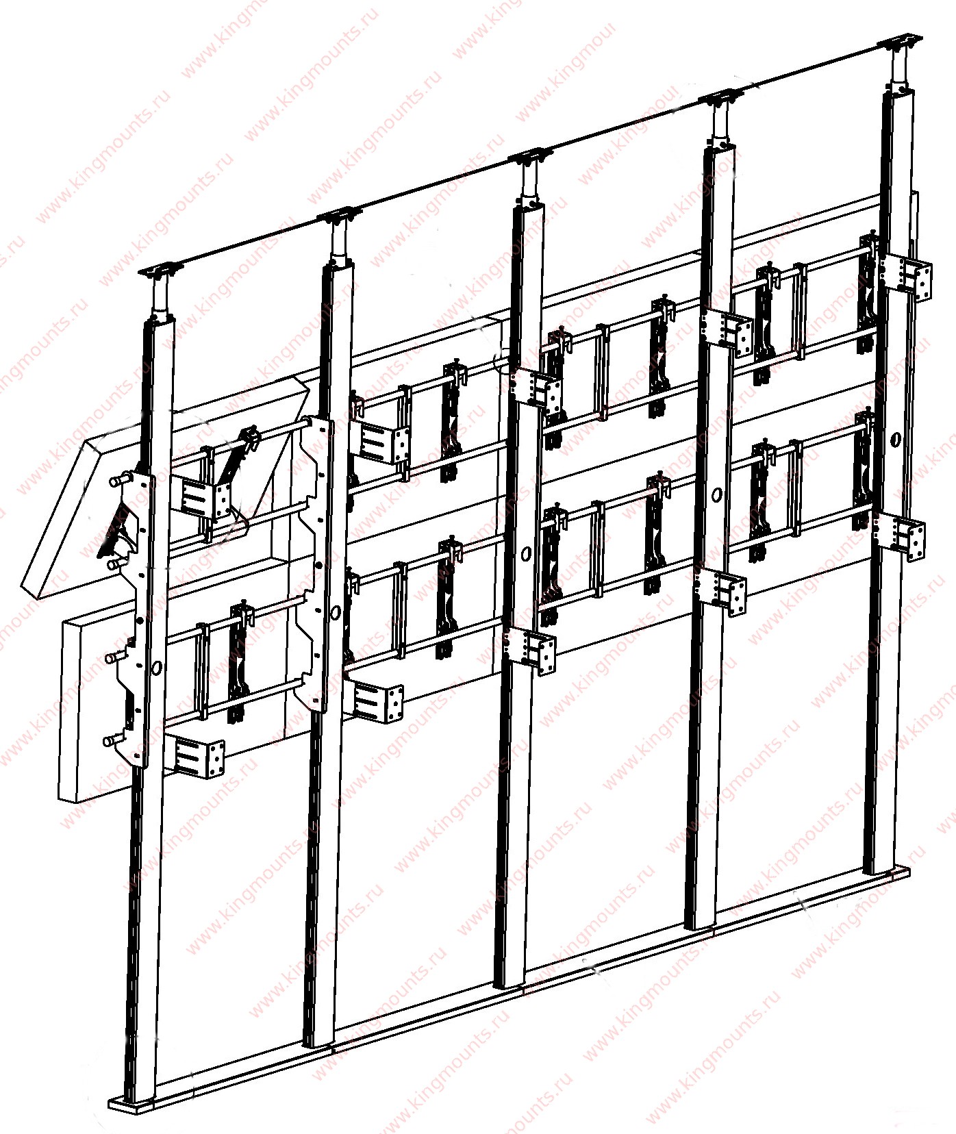 Данное крепление применяется в случаях, когда нет возможности закрепить дисплеи на стене или при создании видеоперегородки в магазинах, переговорных, гостиницах и т.д. Вертикальные столбы каркаса изготовлены из специального профиля, обеспечивающего регулировку по всему диапазону высот. Глубина крепления не менее 800 мм. – вы спокойно сможете разместить за дисплеями оборудование и источники сигнала и питания. После монтажа такого крепления для видеостены, все элементы метало-каркаса,легко декорируются. Юстировка дисплеев (выравнивание) осуществляется в трех плоскостях, в диапазоне 25 мм. с помощью системы микро регулировкиiwall. Шаг микро регулировки: 0,1 мм. Технологический зазор между панелями должен составлять не менее 1 мм. Крепление универсальное и подходит для дисплеев любых производителей. В комплекте крепления прилагается инструкция и чертеж разработанная именно под ваш случай и задачу.