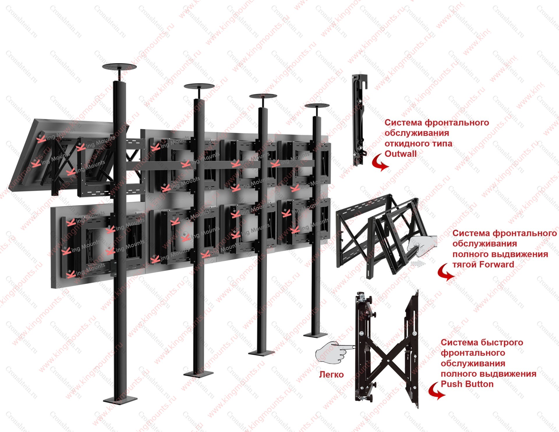 Сервисная система обслуживания дисплеев может быть, как простой- если есть возможность доступа к дисплеям с задней стороны, так и специальной. Российская система креплений видеостен KingMounts представлена тремя видами фронтального обслуживания дисплеев для удобства коммутации и горячей замены бесшовных панелей. Outwall-бюджетное решение для большинства случаев, представляет собой систему откидного типа. Каждая панель наклоняется на +45 градусов и ставится на специальные упоры. Forward- система полного выдвижения дисплея тягой с функцией AntiLock (4 противокражныхзамка). Панель выдвигается до 300 мм вперед и после этого можно осуществлять юстировку, коммутацию или замену. Применяется в различных случаях, когда нет доступа к тыльной стороне видеостены, пространство ограничено, а время для коммутации и замены должно быть минимальным. Pushbutton- премиальная система полного выдвижения фронтального обслуживания. Достаточно легкого нажатия на дисплей и противокражный замок отщелкнется а пружинный механизм сам выдвинет дисплей на 300 мм. Вперед. Самое быстрое решение по замене, юстировке и коммутации. Применяется в случаях, когда времени на стандартный монтаж нет и в случаях, когда видеостена ставится в нишу или декорируется с минимальными зазорами по краям не более 10мм.