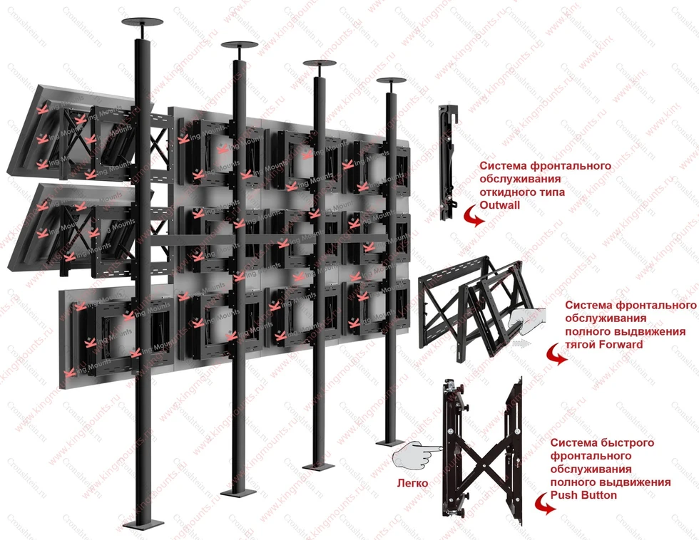 Сервисная система обслуживания дисплеев может быть, как простой- если есть возможность доступа к дисплеям с задней стороны, так и специальной. Российская система креплений видеостен KingMounts® представлена тремя видами фронтального обслуживания дисплеев для удобства коммутации и горячей замены бесшовных панелей. Outwall-бюджетное решение для большинства случаев, представляет собой систему откидного типа. Каждая панель наклоняется на +45 градусов и ставится на специальные упоры. Forward- система полного выдвижения дисплея тягой с функцией AntiLock (4 противокражныхзамка). Панель выдвигается до 300 мм вперед и после этого можно осуществлять юстировку, коммутацию или замену. Применяется в различных случаях, когда нет доступа к тыльной стороне видеостены, пространство ограничено, а время для коммутации и замены должно быть минимальным. Pushbutton- премиальная система полного выдвижения фронтального обслуживания. Достаточно легкого нажатия на дисплей и противокражный замок отщелкнется а пружинный механизм сам выдвинет дисплей на 300 мм. Вперед. Самое быстрое решение по замене, юстировке и коммутации. Применяется в случаях, когда времени на стандартный монтаж нет и в случаях, когда видеостена ставится в нишу или декорируется с минимальными зазорами по краям не более 10мм.