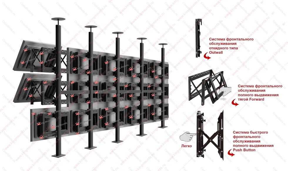 Сервисная система обслуживания дисплеев может быть, как простой- если есть возможность доступа к дисплеям с задней стороны, так и специальной. Российская система креплений видеостен KingMounts представлена тремя видами фронтального обслуживания дисплеев для удобства коммутации и горячей замены бесшовных панелей. Outwall-бюджетное решение для большинства случаев, представляет собой систему откидного типа. Каждая панель наклоняется на +45 градусов и ставится на специальные упоры. Forward- система полного выдвижения дисплея тягой с функцией AntiLock (4 противокражныхзамка). Панель выдвигается до 300 мм вперед и после этого можно осуществлять юстировку, коммутацию или замену. Применяется в различных случаях, когда нет доступа к тыльной стороне видеостены, пространство ограничено, а время для коммутации и замены должно быть минимальным. Pushbutton- премиальная система полного выдвижения фронтального обслуживания. Достаточно легкого нажатия на дисплей и противокражный замок отщелкнется а пружинный механизм сам выдвинет дисплей на 300 мм. Вперед. Самое быстрое решение по замене, юстировке и коммутации. Применяется в случаях, когда времени на стандартный монтаж нет и в случаях, когда видеостена ставится в нишу или декорируется с минимальными зазорами по краям не более 10мм.