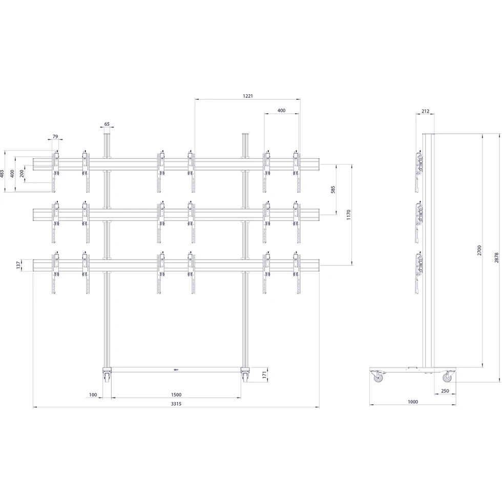Напольный мобильный стенд для видеостены 3х3 из дисплеев 49–55''. Альбомная ориентация. Стандарт VESA 200x200..400x400 мм. Юстировка каждого дисплея в 3 плоскостях. Сервисное положение. Длина штанги с основанием: 2700 мм. Скрытый кабель-канал CIS®. Макс. нагрузка: 396 кг. Макс. масса одного дисплея: 44 кг. Цвет черный.