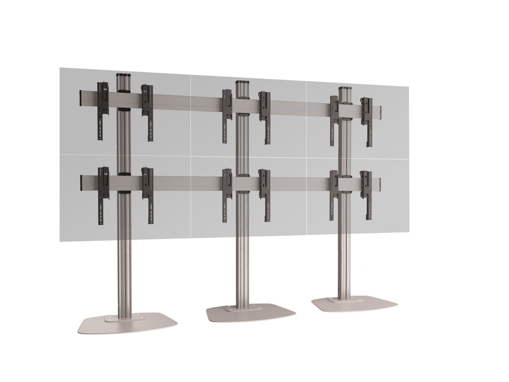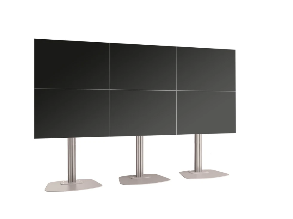 Напольный стационарный стенд для видеостены 2х3 Vogels F2344S. арт 8933 из дисплеев с диагональю экрана 42-50''. Альбомная ориентация. Стандарт VESA от 200x200 до 400x400 мм. Возможна регулировка каждого дисплея в трех плоскостях и перевод в сервисное положение. Высота штанги - 200 см. Предусмотрен скрытый кабель-канал CIS. Допустимая нагрузка - 180 кг. Мах масса одного дисплея - 30 кг. Цвет серебристый.