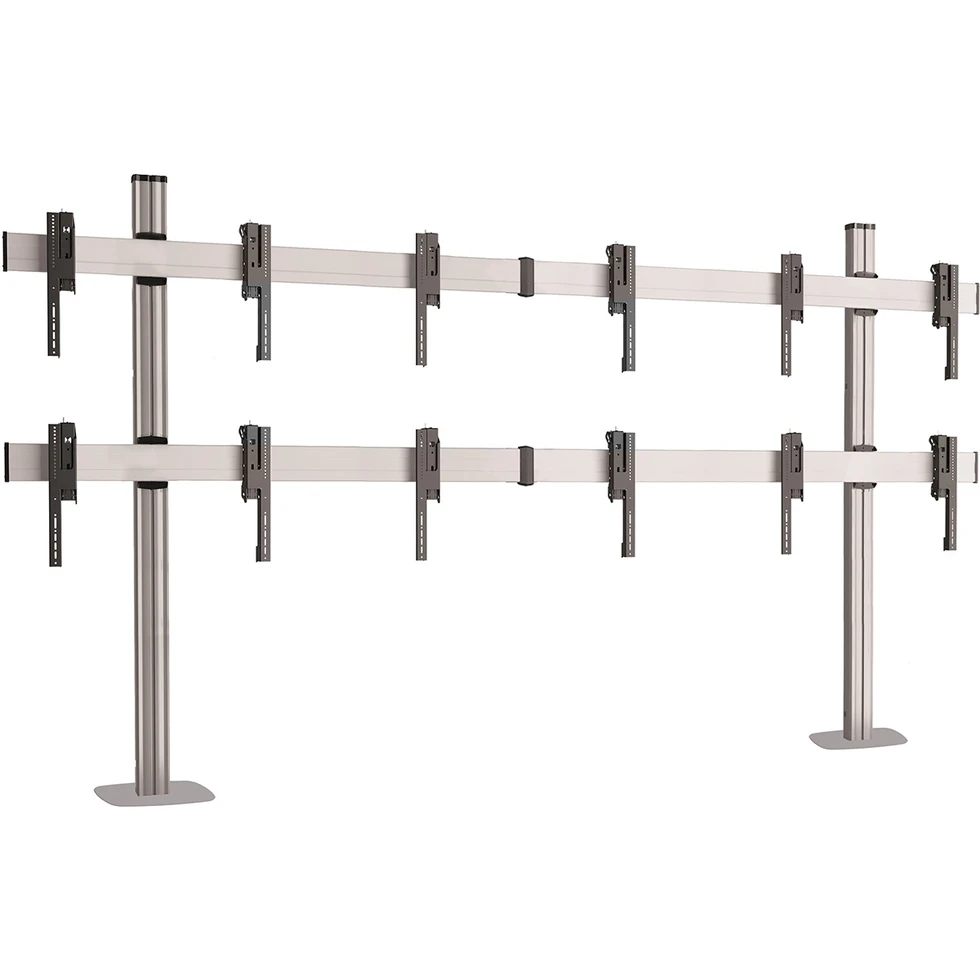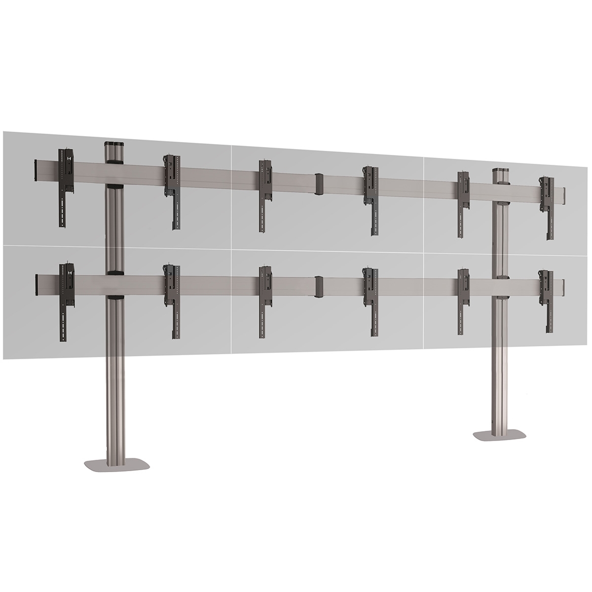 Напольный стенд для видеостены 2х3 из дисплеев 50–60'' с фиксацией к полу. Альбомная ориентация. Стандарт VESA 200x200..800x400 мм. Юстировка каждого дисплея в 3 плоскостях. Сервисное положение. Длина штанги: 2000 мм. Скрытый кабель-канал CIS®. Макс. нагрузка: 300 кг. Макс. масса одного дисплея: 50 кг. Цвет серебристый.