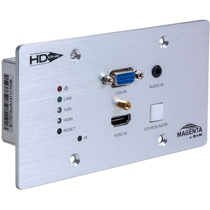 Настенная панель-передатчик / масштабатор / коммутатор c автопереключением сигналов HDMI 1.4 4Kx2K/60, VGA 1920х1080/60 с аудио (miniJack 3,5 мм), ИК и RS-232 в витую пару CAT5e c PoH от приемника, HDBaseT (возможна совместная работа с модулями CORIO CM-HDBT), расстояние передачи до 70 м. Совместимый приемник: MG-CT-612. Исполнение для Европы.