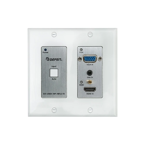 Настенная панель-передатчик / масштабатор / коммутатор c автопереключением сигналов HDMI (4096x2160/30 при YUV 4:4:4, 3840x2160/60 при YUV 4:2:0, 3D) с HDCP 1.4, EDID и CEC, VGA (D-Sub-15) 1920х1200/60 с аудио (miniJack 3,5 мм), RS-232 в витую пару CAT5e, PoH (Power over HDBaseT). HDBaseT, управление по ИК, расстояние передачи: 4K – до 40 м, 1080p – до 70 м, поддержка Syner-G. Полоса пропускания 600 МГц. Установка 2G USA. Цвет белый.