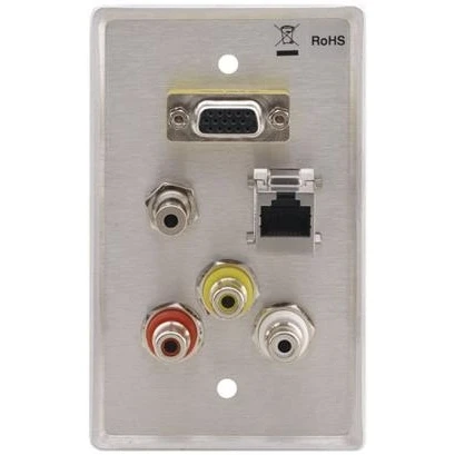 Настенная панель-переходник с проходными разъемами для VGA (розетки HD15), RJ45, стереоаудио (3,5-мм розетки) и 3xRCA.