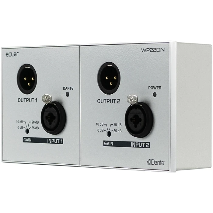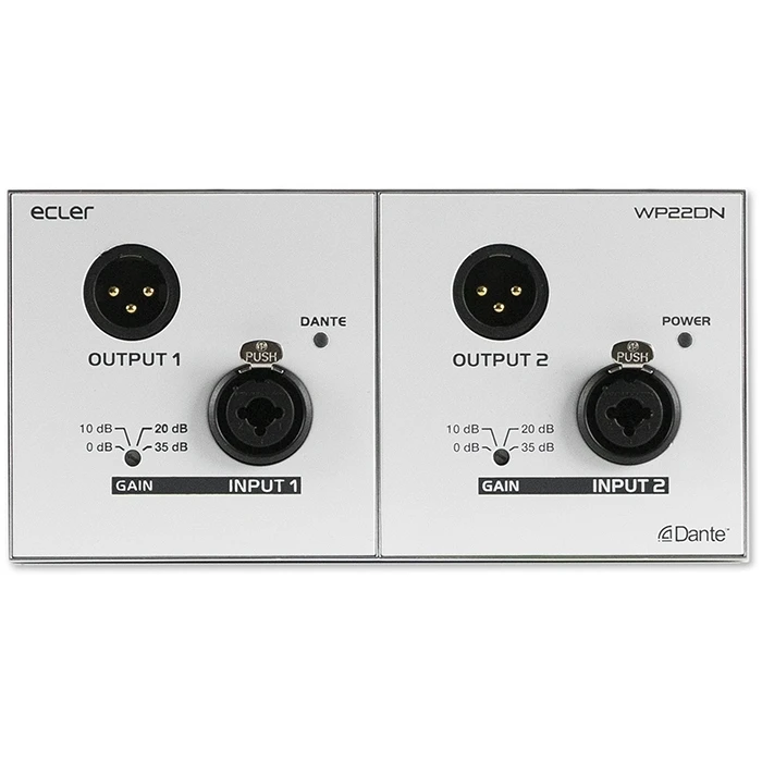 Настенная панель, транскодер аналоговых аудиосигналов и сигналов интерфейса Dante, двухканальный (вход/выход 2хXLR), питание по PoE 48 В или внешнее.