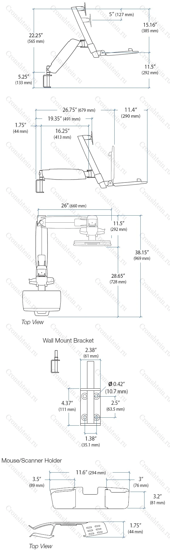 • В комплекте: Крепление "рука" HD Combo, 34" настенный рельс с 2 черными заглушками, малый держатель CPU, 2х10" короба д/кабелей, скобы для крепления на рельс "руки" и держателя CPU, крепежи для монтажа на бетонную и пустотелую стену, регулирумое по высоте крепление д/монитора, пенная подкладка под запястья, держатели для сканера и мыши, встроенная подставка д/клавиатуры с левым/правым ковриком д/мыши, ручка, крепежи для проводов