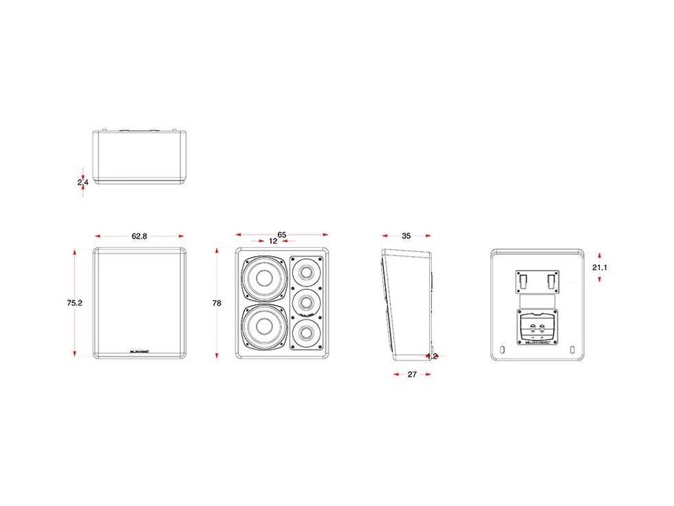 Настенная 2 полосная АС верхнего уровня для использования в качестве правого или центрального канала, закрытый корпус. Три однодюймовых мягкокупольных твитера на монолитной плите. Два 5.25 СЧ/НЧ динамика.  Диапазон частот 77 гц - 20 кГц. Рекомендуемая мощность 25-400 ватт.  Чувствительность 90дБ, 2.83V1m. Сопротивление 4 ома. Размеры (ШхВхГ): 266х303х142 мм и 266х315х107мм. Вес: 7,9 кг. Цвет: Белый матовый.