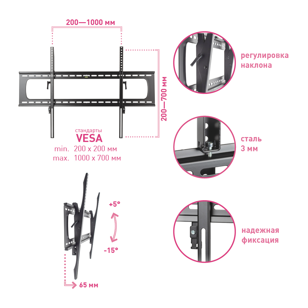 Дополнительно: Универсальная система крепления по горизонтали от 200 мм до 1000 мм, по вертикали от 200 мм до 700 мм.