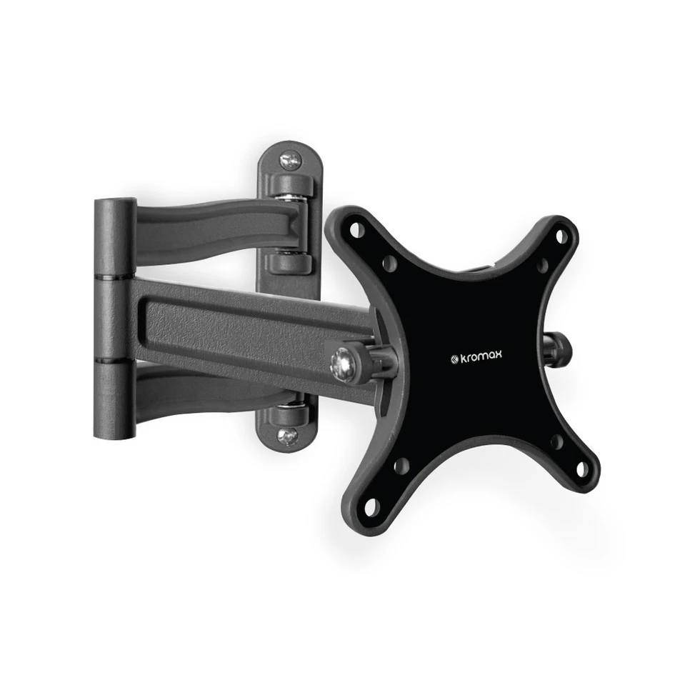 Настенный кронштейн Kromax TECHNO-1.арт 9075. Линию алюминиевых кронштейнов Techno можно назвать прорывом в дизайне креплений для небольших и средних плоских телевизоров. Крепления данной серии являются оптимальным вариантом шарнирного кронштейна небольшого размера и отличаются оптимальной подвижностью, надежностью и неповторимым оригинальным внешним видом. Элегантная литая алюминиевая конструкция крепления, несмотря на небольшой вес кронштейна, обеспечивает необходимую поддержку LCD/LED телевизоров с размерами диагонали от 10 до 26 дюймов и максимальным весом до 15 кг. Шарнирная двухколенная конструкция изделий позволяет разнообразным образом изменять положение телеэкрана для наиболее удобного просмотра зрителями.