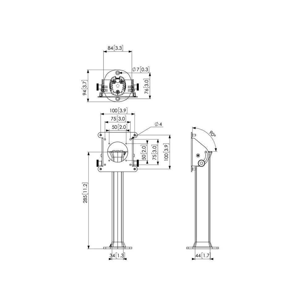 Настольная фиксируемая стойка для монтажа защитных кожухов TabLock, а также небольших интерактивных дисплеев. Наклон кожуха: 0..90°. Скрытые кабель-каналы. Основание жестко фиксируется к столешнице болтами, закрывается декоративной накладкой. Размер основания: 84х94 мм. Высота стойки: 285 мм. Стандарт VESA 50х50, 75х75, 100х100 мм. Макс. нагрузка: 3 кг. Цвет серебристый.
