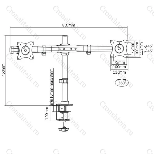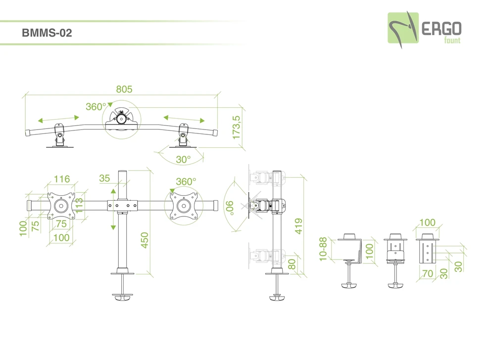 Настольный кронштейн ERGO BMMS-02. арт 7344 это универсальный настольный крепеж для большинства дисплеев от 13 до 27 дюймов и весом до 10 кг. Вращение на 360°, альбомная или портретная ориентация. Наклон на ±45° и поворот на ±15°. Кабель-канал. Крепление к столу: зажим или втулка.