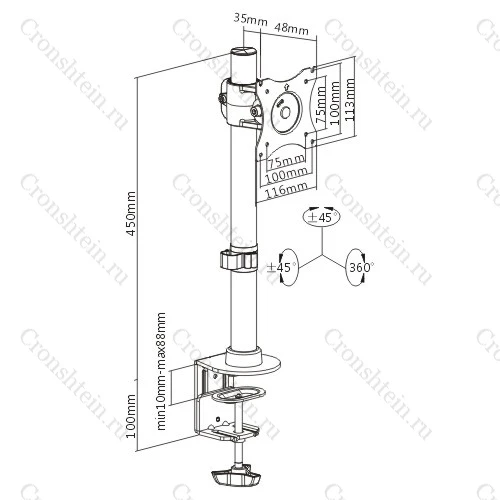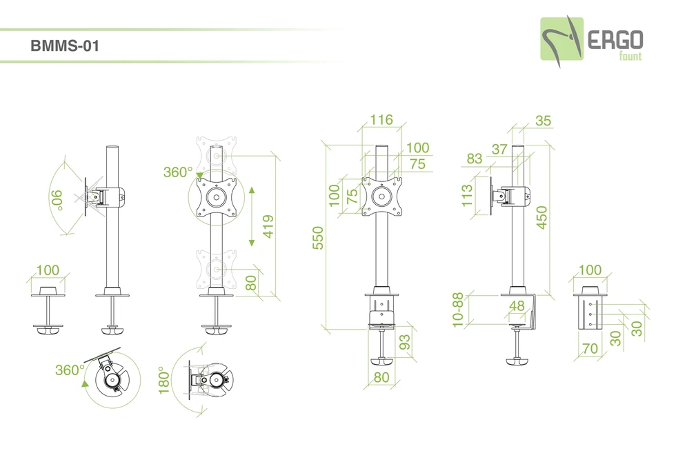 Настольный кронштейн ERGO BMMS-01. арт 7349 это универсальный настольный крепеж для большинства дисплеев от 13 до 27 дюймов и весом до 10 кг. Вращение на 360°, альбомная или портретная ориентация. Наклон на ±45° и поворот на ±45°. Кабель-канал. Крепление к столу: зажим или втулка.