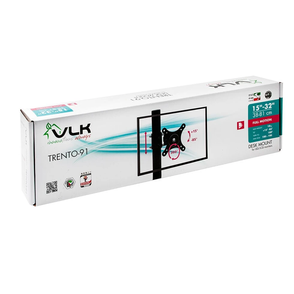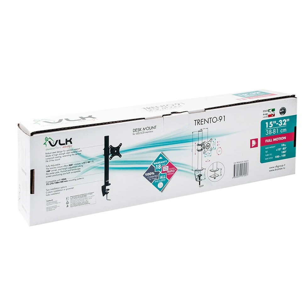 Крепление VLK TRENTO-91 подходит для большинства мониторов от 15 до 32 дюймов (38 -81см) и максимальным весом до 10 кг.