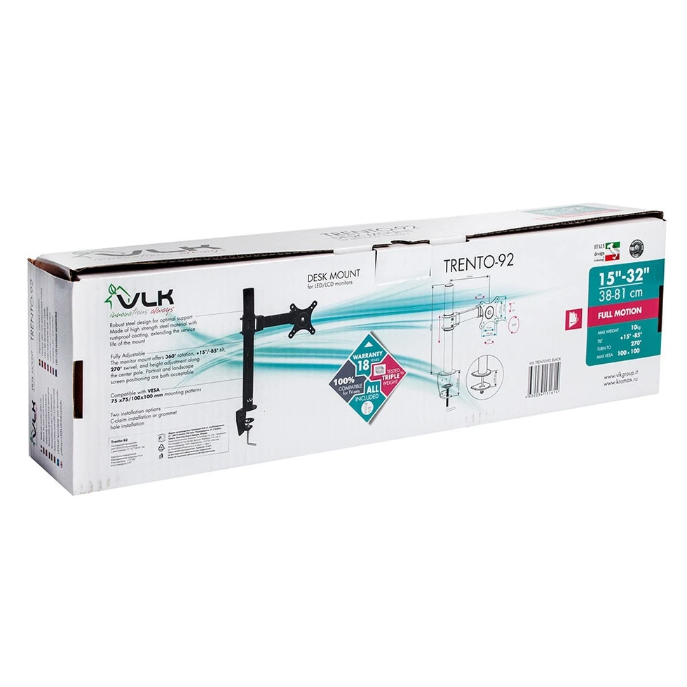 Крепление VLK TRENTO-92 подходит для большинства мониторов от 15 до 32 дюймов (38 -81см) и максимальным весом до 10 кг.