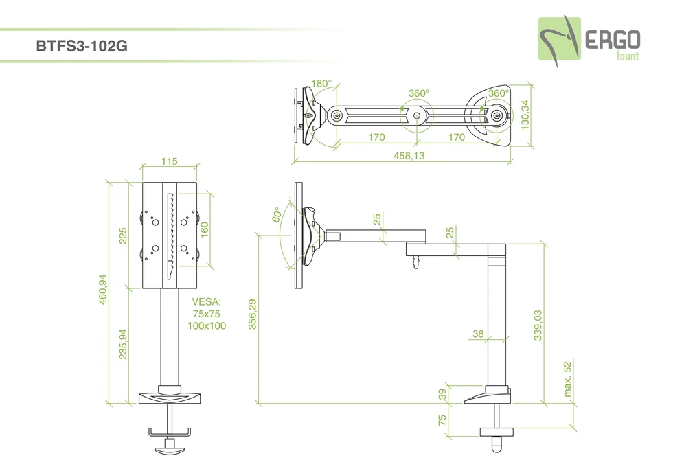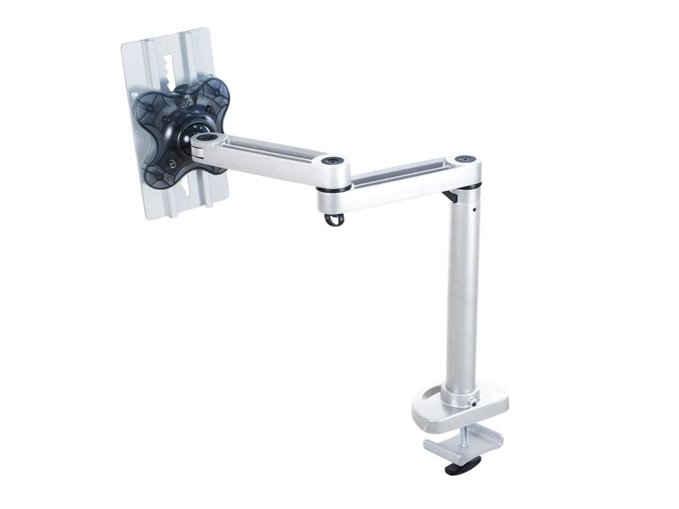 Настольный кронштейн ERGO BTFS3-102G. арт 7966 с шарнирным двухколенным вылетом для одного монитора диагональю 8 - 40". Объемное основание (литье под давлением). Доступна регулировка высоты адаптера по вертикали в пределах 160 мм при помощи AS-09X, где ступенчатый механизм обеспечивает шаг паза в 11 мм. Вылет шарнирного колена составляет 340 мм с поворотом 360° у основания и между собой.