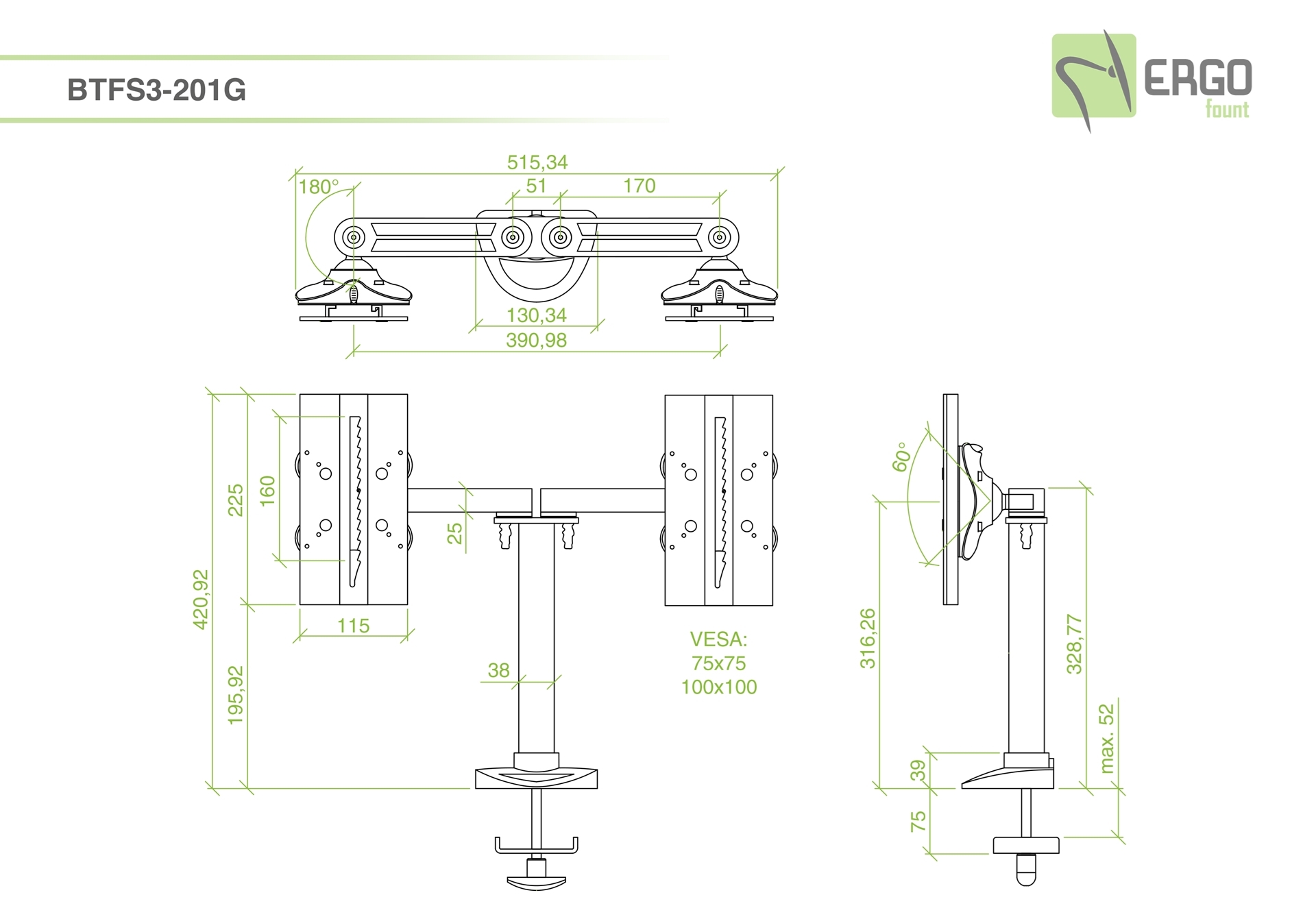 Настольный кронштейн ERGO BTFS3-201G. арт 7968 с шарнирным коленом для двух мониторов диагональю 8 - 17". Объемное основание (литье под давлением). Доступна регулировка высоты адаптера по вертикали в пределах 160 мм при помощи AS-09X, где ступенчатый механизм обеспечивает шаг паза в 11 мм. Вылет шарнирного колена составляет 170 мм с поворотом 174° у основания.
