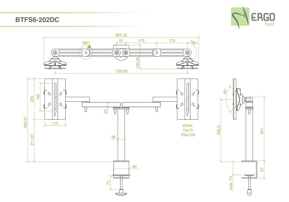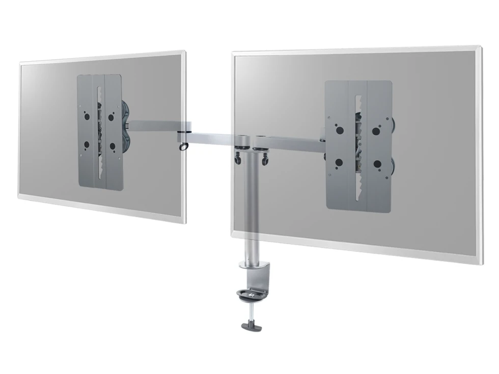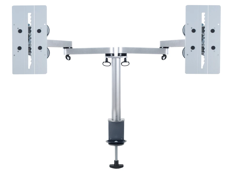 Настольный кронштейн ERGO BTFS6-202DC. арт 7979 с шарнирными двухколенными вылетами для 2-х мониторов диагональю 8 - 31.5". Основание выполнено в виде пластины. Доступна регулировка высоты адаптера по вертикали в пределах 160 мм при помощи AS-09X, где ступенчатый механизм обеспечивает шаг паза в 11 мм. Вылет шарнирного колена составляет 340 мм с поворотом 174° у основания и 360° между собой.