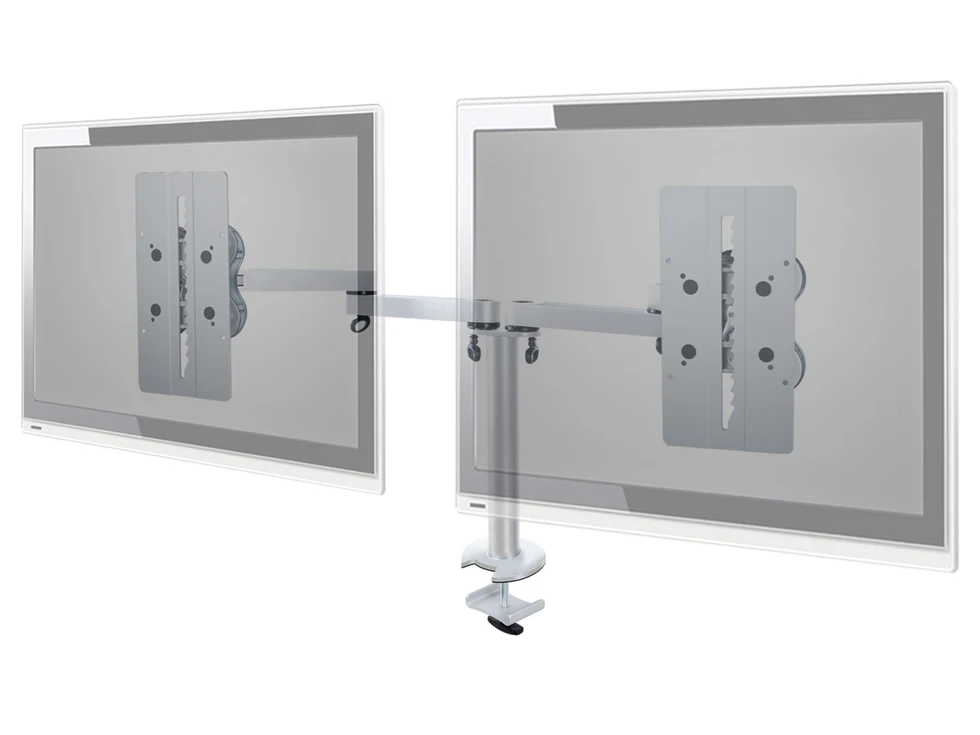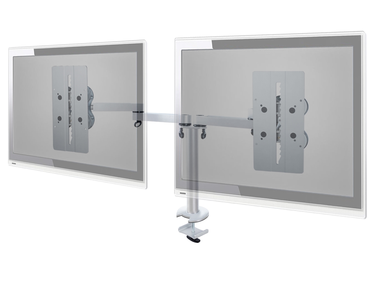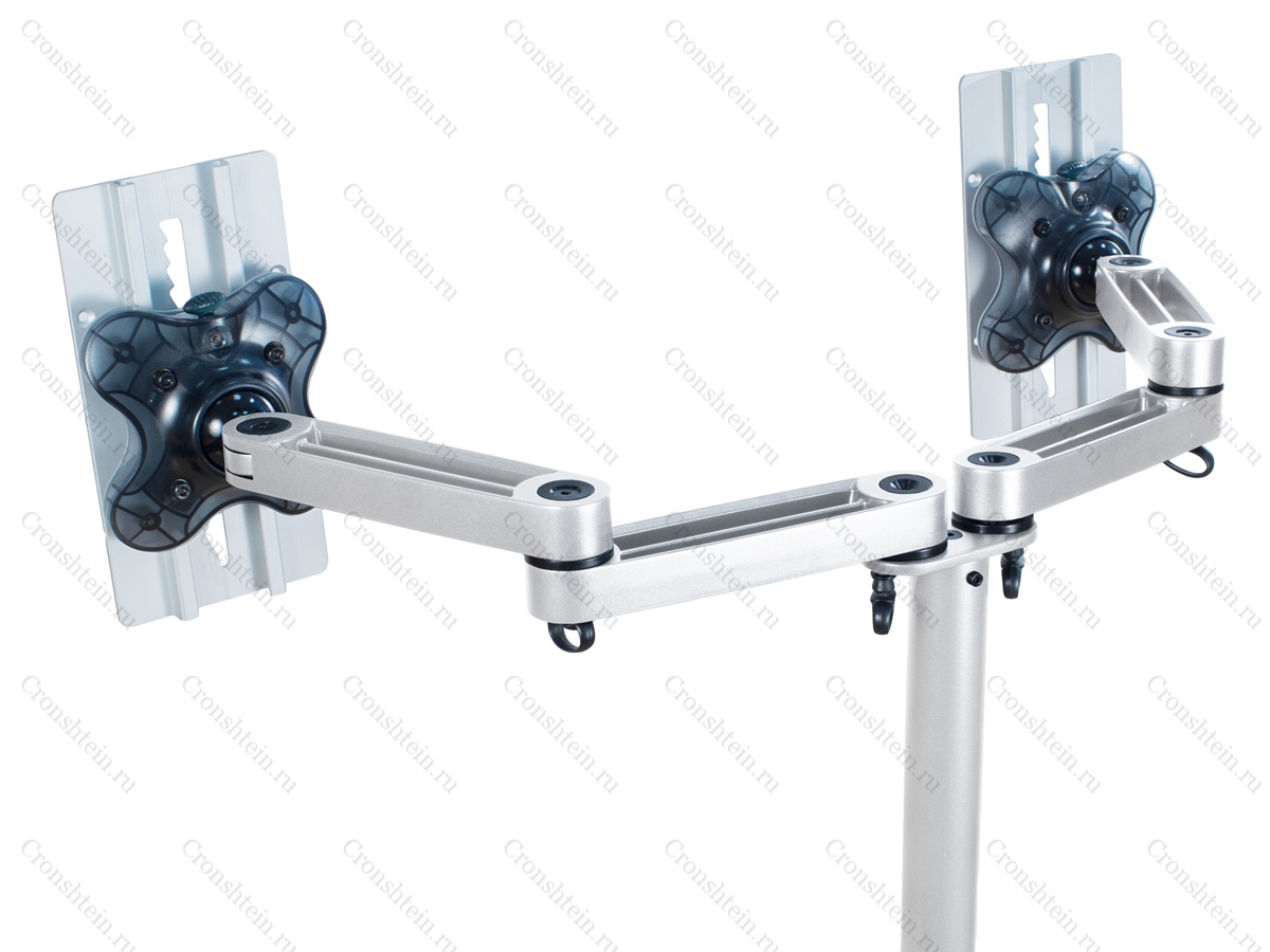 Кронштейн с навесным адаптером стандарта VESA 75х75, 100х100 мм, вращением 360° (для книжной и альбомной ориентации), наклоном ±35°, поворотом ±90°. Конструкцией предусмотрены клипсы, организующие кабель-канал (4 шт.). Для монитора предусмотрена антивандальная защита (от демонтажа адаптера) - замок AS-07X приобретается отдельно. Материал: алюминий с декоративным пластиком. Монтаж к поверхности струбциной «G» между столов или через отверстие 15 мм. Габаритные размеры: (521-650)x856x128 мм. Максимальная нагрузка 24 кг.