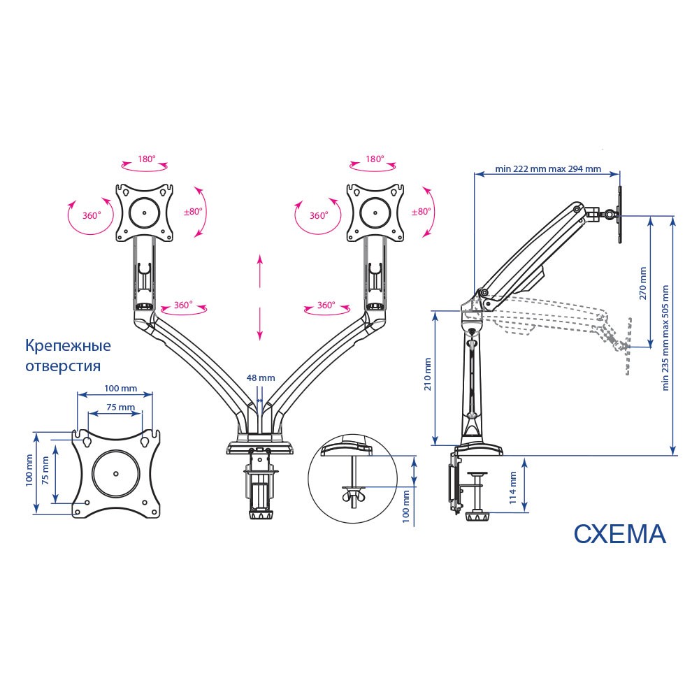 • Угол наклона: +/-80°