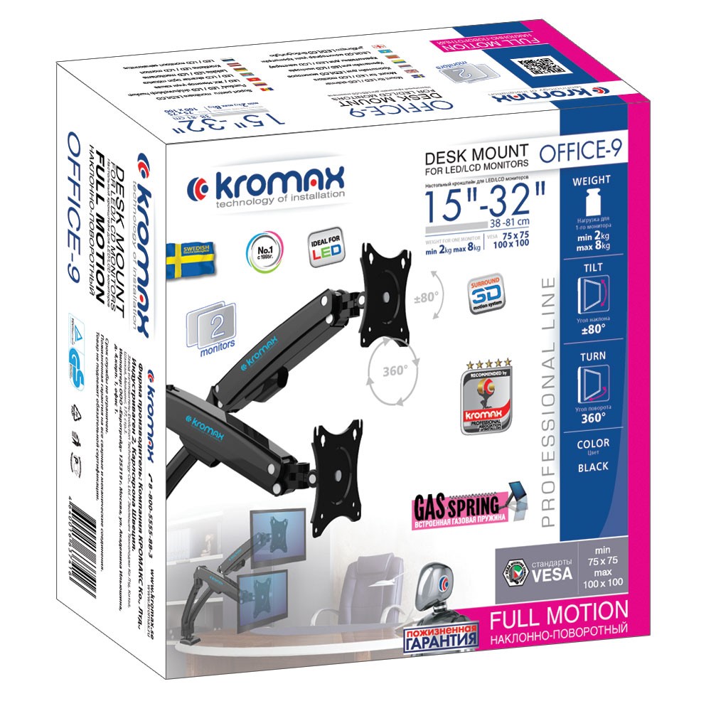 Настольный кронштейн Kromax Office-9.арт 9095 идеально подходит для 2-х мониторов с диагональю экрана от 15 до 32 дюймов (38-81 см) и весом 2х8 кг.