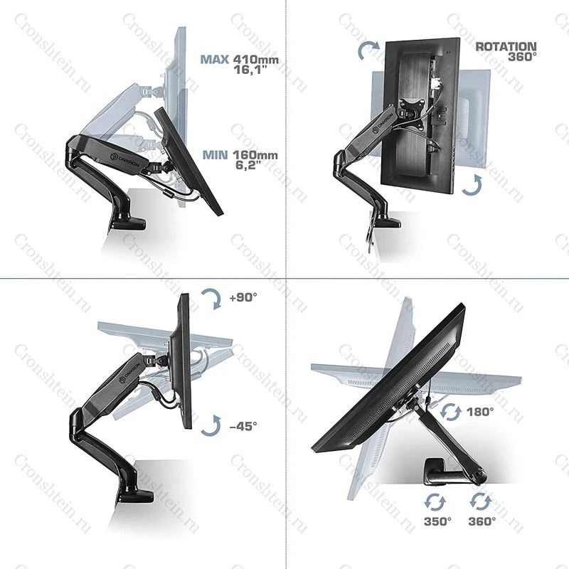 Кронштейн ONKRON G80 не оставит никого равнодушным, не только потому, что подходит для всех мониторов и телевизоров, диагональю от 13" до 27" и весом от 2кг до 6,5 кг, но и потому, что позволяет легко и просто передвигать монитор в любых плоскостях, и даже менять его положение по вертикали! Всё это благодаря газовой пружине, располагающейся внутри корпуса кронштейна, именно она может зафиксировать монитор в любом положении и менять его не прилагая существенных усилий. Поворачивайте монитор вокруг своей оси на 360°, наклоняйте вверх и вниз, придвигайте или удаляйте от себя, поднимите монитор повыше или опустите пониже - всё это может наш кронштейн ONKRON G80.