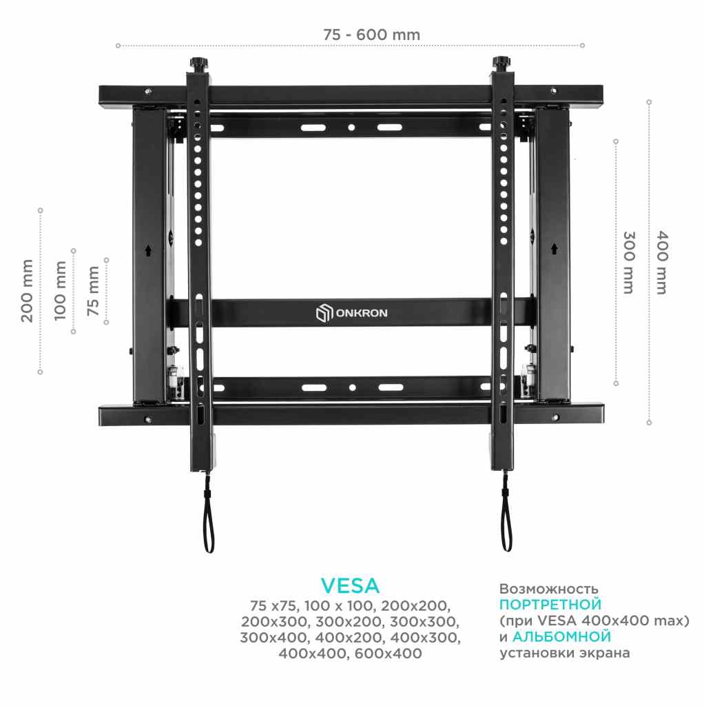 Производитель предусмотрел различные варианты крепления VESA:75 x75, 100x100, 200х200, 200х300, 300х200, 300х300, 300x400, 400x200, 400x300, 400х400, 600x400 мм. Широкий выбор делает максимально удобным подбор размещаемой панели.