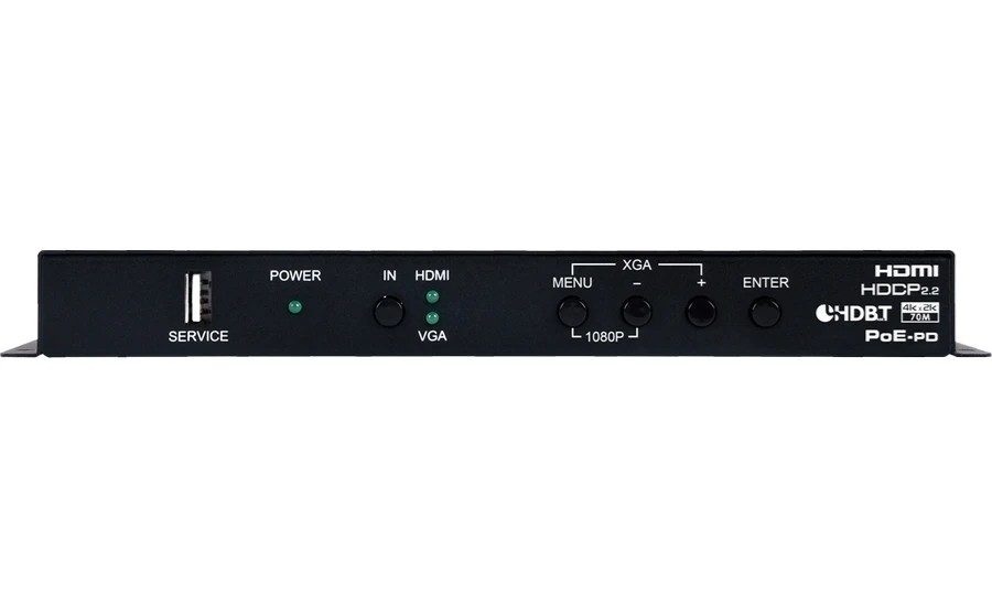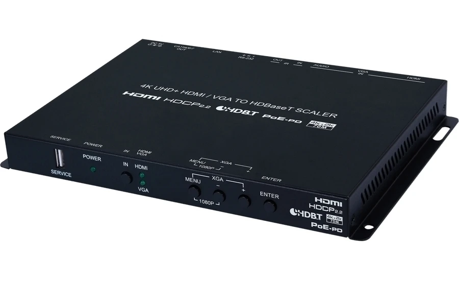 Передатчик / коммутатор / масштабатор сигналов HDMI 4K/60 (до 4:2:0, 8 бит) c HDCP 1.4 (2.2) и VGA 1080p60, также передаются Ethernet (RJ45), ИК (2х miniJack 3,5 мм) и RS-232 (D-Sub-9) в витую пару CAT5e с PoH (Power over HDBaseT) 48 В, расстояние передачи до 100 м (4K – 70 м). Эмбеддер небалансного аудио. Совместимый приемник: CSC-V101PRX.