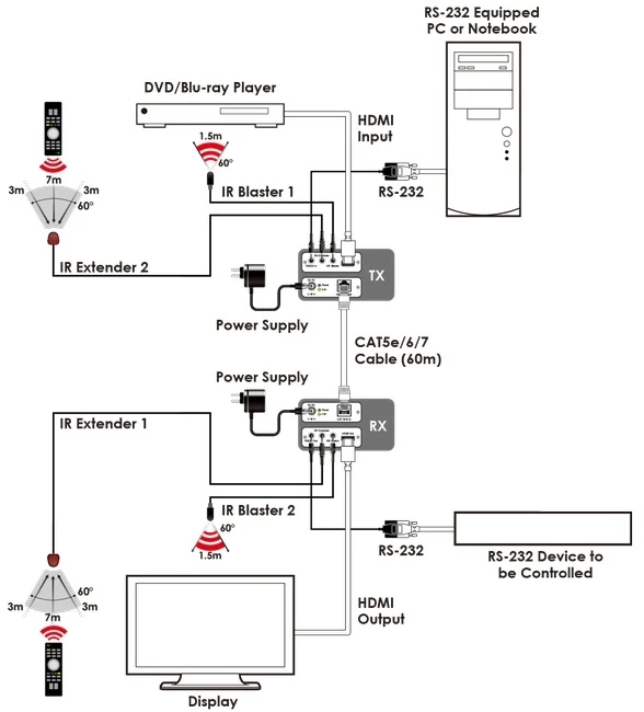Передатчик сигналов HDMI 1.4 1080p/60 (4Kх2K, 3D) с HDCP и CEC, ИК (2x miniJack 3,5 мм) и RS-232 (miniJack 3,5 мм) в витую пару CAT5e, HDBaseT, расстояние передачи до 60 м.