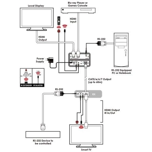 Передатчик сигналов HDMI 1080p/60 (4Kх2K, 3D) с HDCP и EDID, ИК (2х miniJack 3,5 мм) и RS-232 (miniJack 3,5 мм) в витую пару CAT5e, HDBaseT, проходной выход HDMI, расстояние передачи до 60 м.