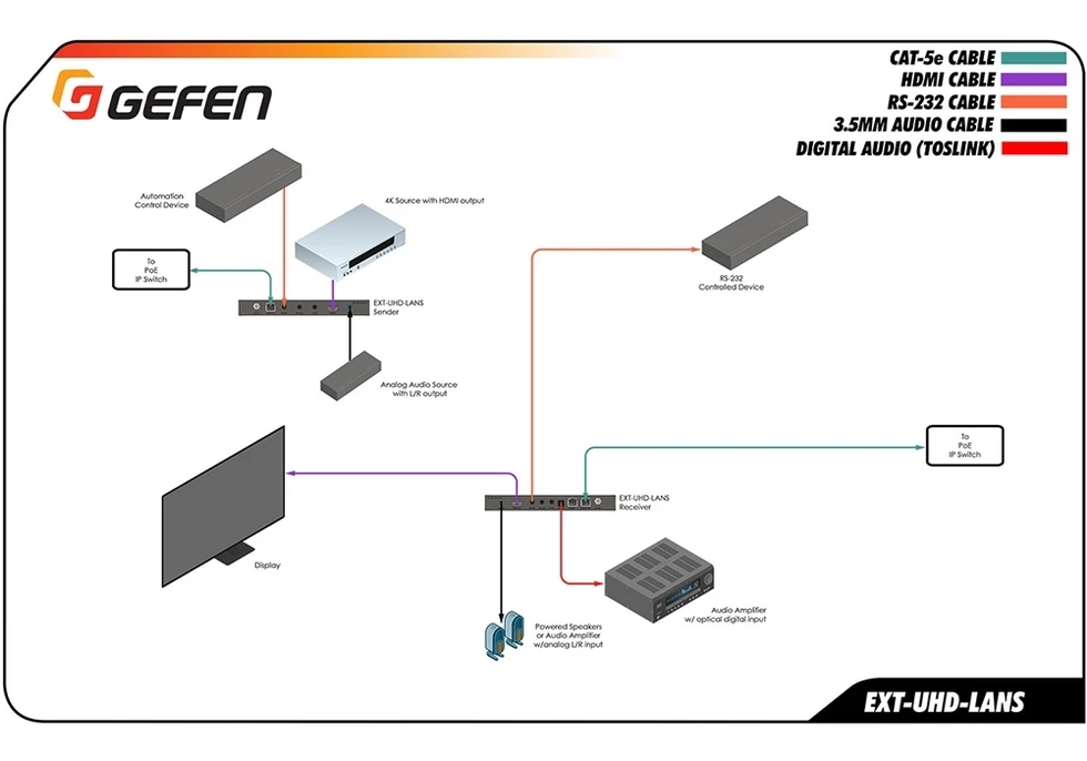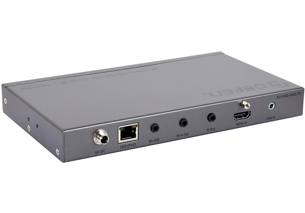 Передатчик сигналов HDMI (4K/60 4:2:0) c EDID, HDCP 1.4/2.2 и HDR, RS-232 (miniJack 3,5 мм), стереоаудио (miniJack 3,5 мм) и двунаправленного ИК (2х miniJack 3,5 мм) в 1000BaseT c PoE, «виртуальная матрица» до 65000 устройств, управление: по IP, web-интерфейс, EXT-CU-LAN.