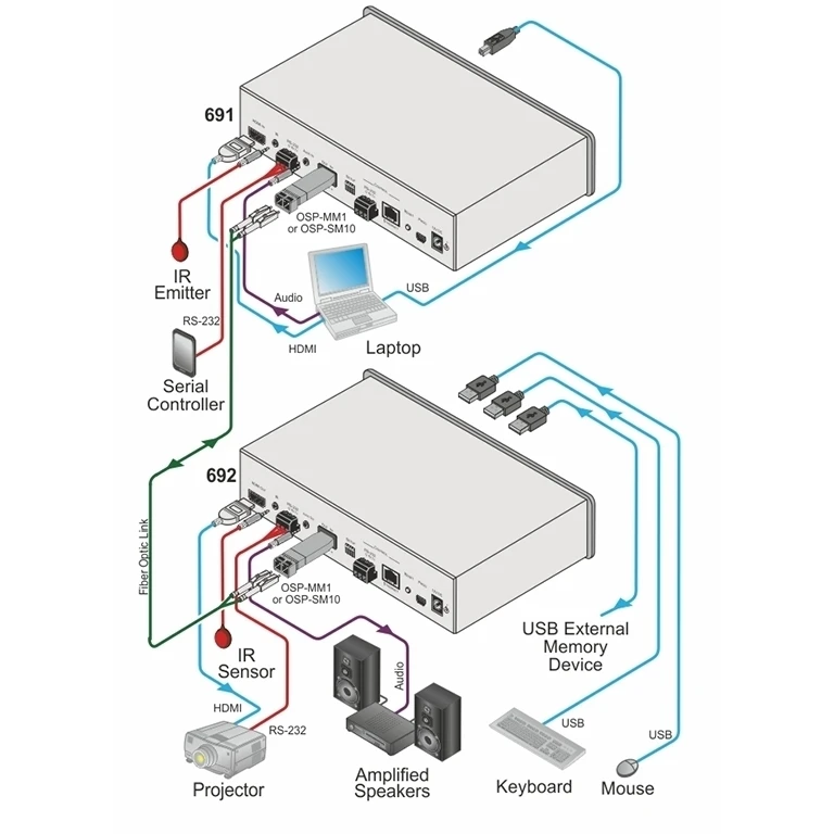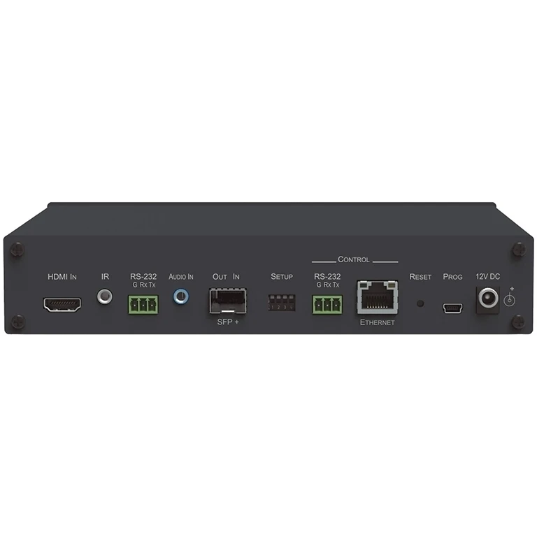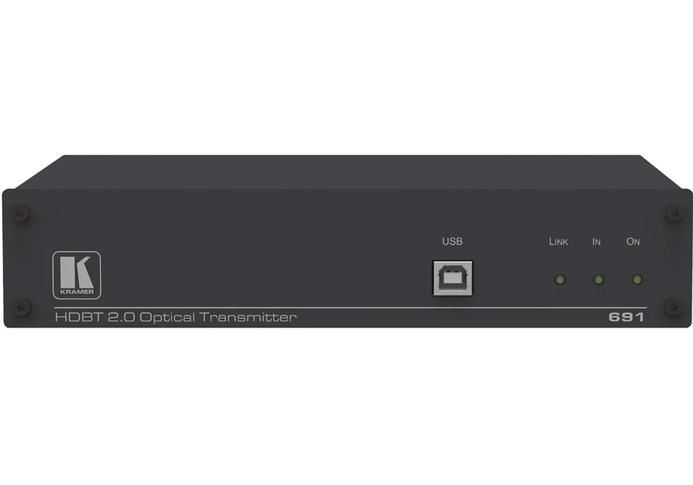 Передатчик сигналов HDMI 4K/60 (YUV 4:2:0), стереоаудио, RS-232, ИК, USB 2.0 и Ethernet по волоконно-оптическому кабелю с использованием SFP-модулей OSP-MM1 или OSP-SM10. Управление по RS-232 и IP (web-интерфейс и сеть Kramer).