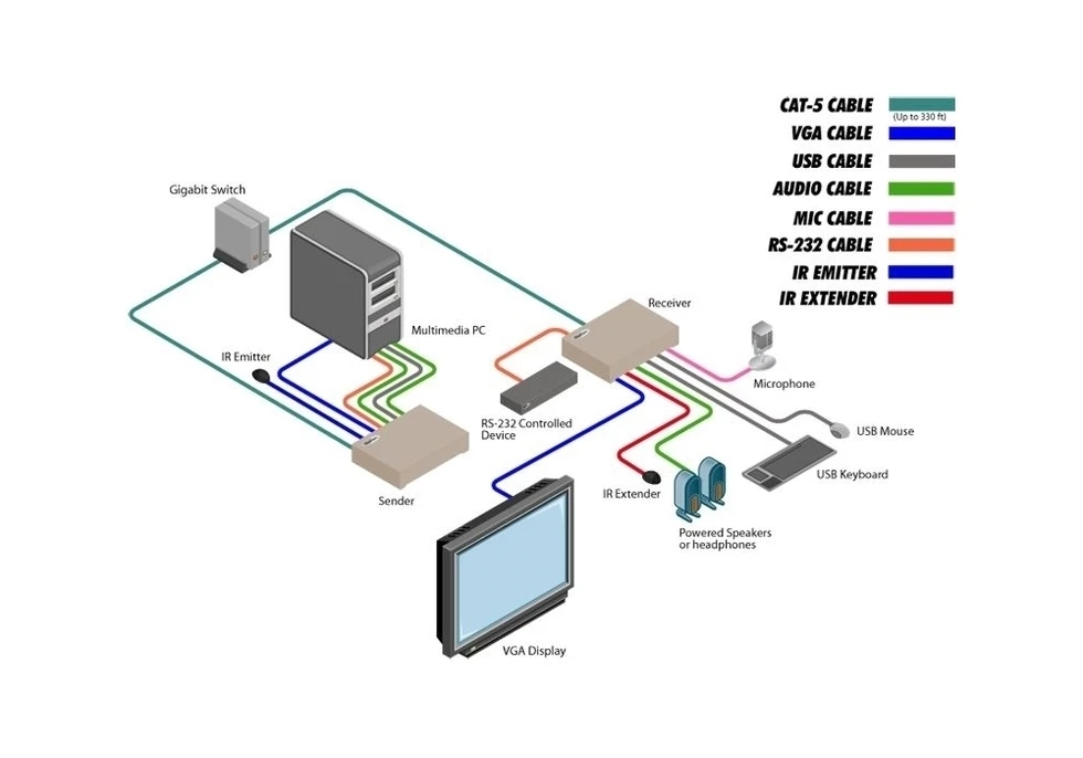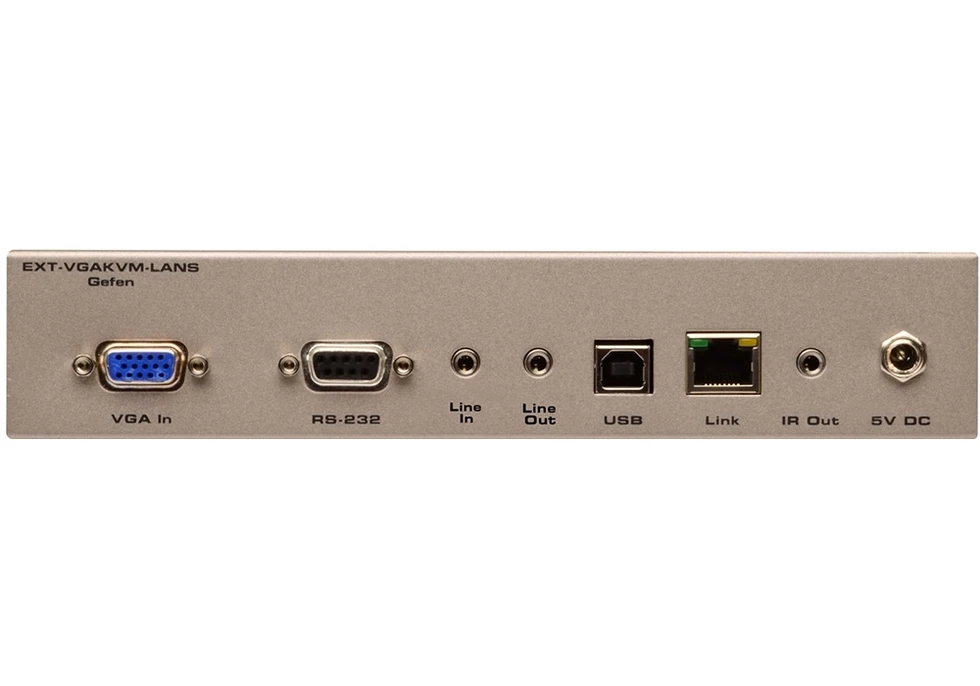 Передатчик сигналов VGA (D-sub-15) 1920х1200 c EDID, USB 2.0, RS-232 (D-sub-9), двунаправленного аудио (2х miniJack 3,5 мм), ИК (miniJack 3,5 мм) в 1000BaseT, виртуальная матрица 255:65000, расстояние – 100 м, управление по IP.