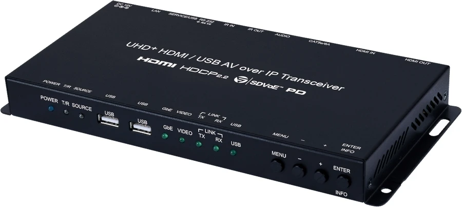Передатчик/приемник сигналов HDMI 4Kх2K/60 (YUV 4:4:4) с 3D, HDCP 1.4/2.2, EDID, HDR, стереоаудио, двунаправленных ИК, RS-232 и 2xUSB 2.0 с работой по витой паре CAT6a (10GBaseT) с PoE (расстояние до 100 м), SDVoE. Возможность видео стены, проходной выход HDMI. Управление по IP, специальное ПО, контроллер CDPS-CS7-S.