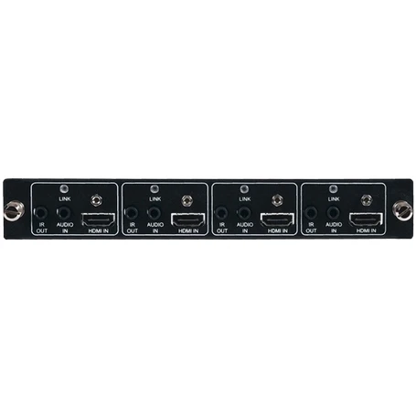 Плата на вход, 4хHDMI до 3840?2160/60 (4:4:4), 4K/24 HDR (4:4:4) с HDCP 1.4, 2.2 и расширенным EDID, полоса пропускания 600 МГц, аудио (4 х miniJack 3,5 мм), излучатель ИК (4 х miniJack 3,5 мм).