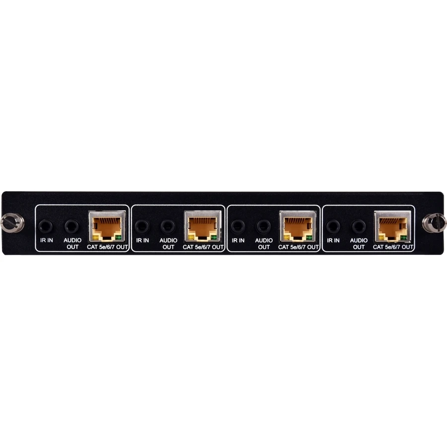 Плата на выход, 4хHDBaseT до 4096x2160/30 (4:4:4) с HDCP 2.2 и расширенным EDID, выходы стереоаудио (4 х miniJack 3,5 мм), выход ИК (4 х miniJack 3,5 мм). Расстояние до 100 м для 1080p, 90 м для 4K. Совместимый приемник: CH-1605RXV.
