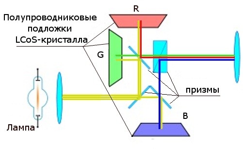 В дорогих проекторах применяется современная, продвинутая технология LCoS. Она сочетает в себе преимущества DLP, LCD, но лишена их недостатков. Технология отличается такими особенностями: