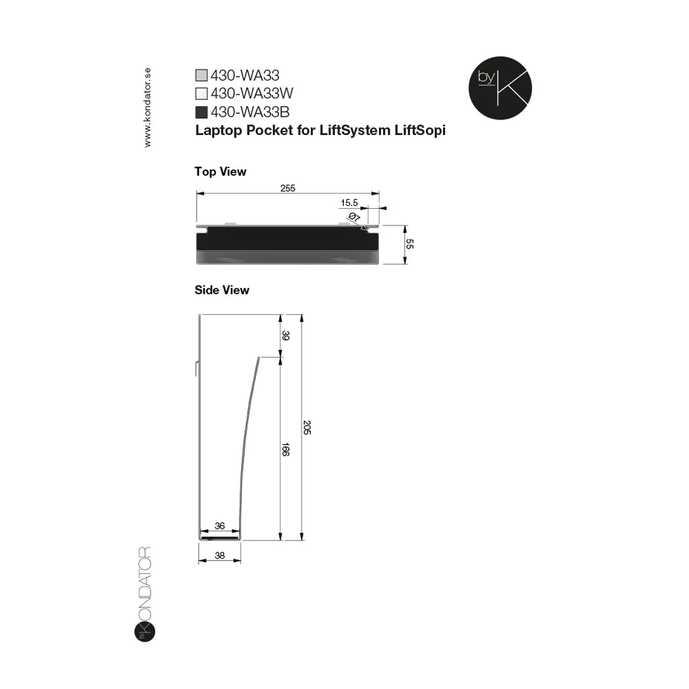 Подставка для хранения ноутбука вертикально или горизонтально под столом. Регулировка расстояния от стола. Макс. габариты ноутбука: до 360 мм по короткой стороне, 35 мм по высоте, без ограничений по длине. Опция: направляющие рельсы LiftSystem 430-WA1x для горизонтального скольжения. Габаритные размеры (ШxГxВ): 255x55x205 мм. Цвет черный.