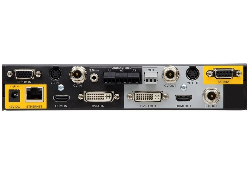 Понижающий масштабатор видео-, аудиосигналов и графики, входы: DVI-U, HDMI, PC/HD, CV, YC. Аудио: вход miniJack 3,5 мм, входы/выходы Phoenix. Выходы:1x DVI-U, 1x SDI, 1x HDMI, 1x CV, 1x YC. Управление: ИК, RS-232, IP.