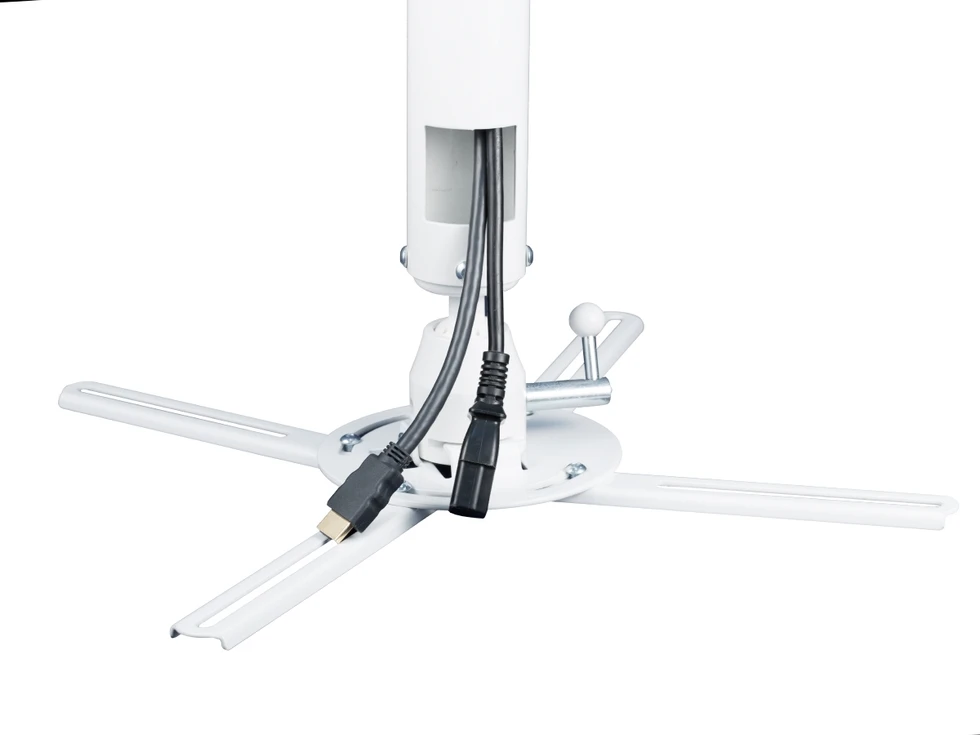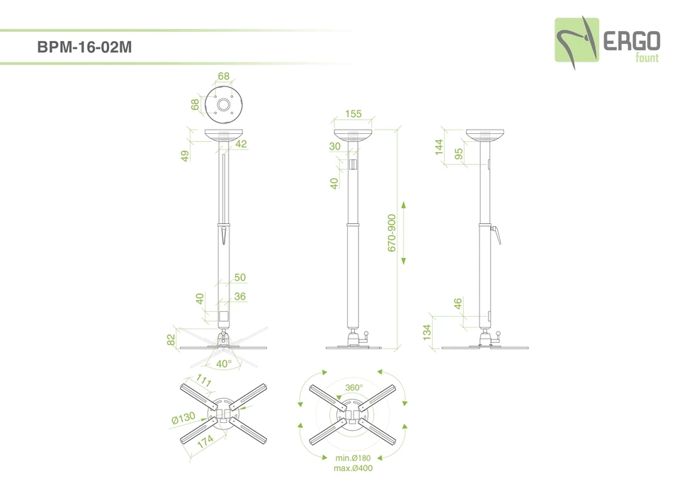 Потолочное крепление для проектора c регулировкой расстояния от потолка ErgoFount BPM-16-02M B. Быстросъемный механизм для обслуживания. Скрытый кабель-канал. Крепление типа «паук», установочный размер 180–400 мм. Вращение: 360°. Наклон: ±20°. Поворот: ±20°. От потолка: 670–900 мм. Материал: сталь, алюминий. Макс. нагрузка: 30 кг. Цвет черный.