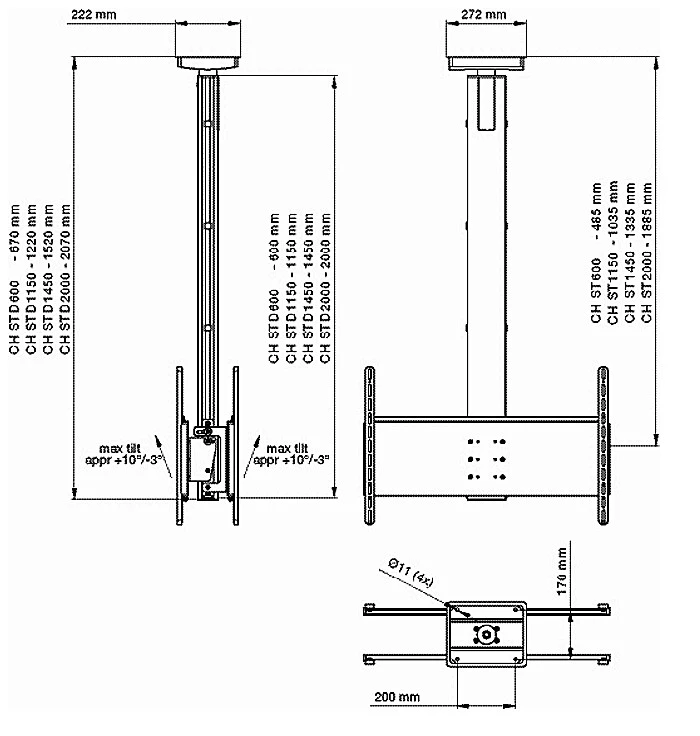 Кронштейн SMS Flatscreen CH STD — одно решение для двух экранов. Он предназначен для размещения двух экранов на одной колонне. Как и в большинстве потолочных кронштейнов, экраны можно наклонять для нахождения наилучшего угла просмотра. Также экраны можно повернуть к любой точке в комнате, а длина колонны регулируется. Это самый элегантный способ подвесить в одном месте два экрана. Может удерживать до 100 кг. Идеально подходит для вестибюля или другого людного места.