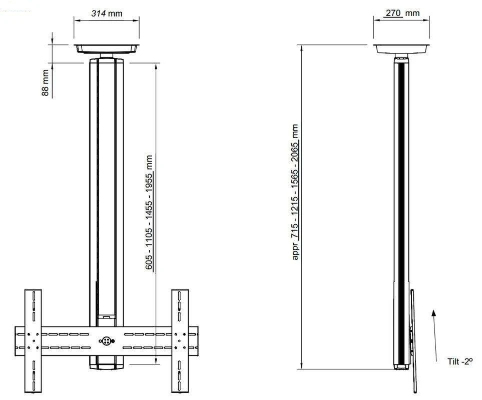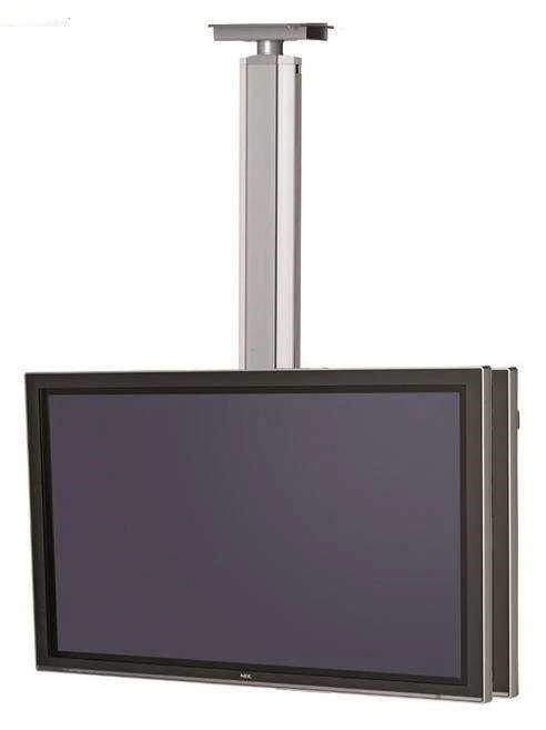 Потолочный крепеж для 2х плоскопанельных телевизоров, общим весом до 100 кг. Телевизоры монтируются тыльной стороной друг к другу. Благодаря специальным шарнирам, экраны телевизоров легко можно повернуть в любую сторону, а также изменить наклон. На обратной стороне штанги есть устройство для электрической розетки (заказывается дополнительно). Кабели убираются в специальный желоб в штанге.