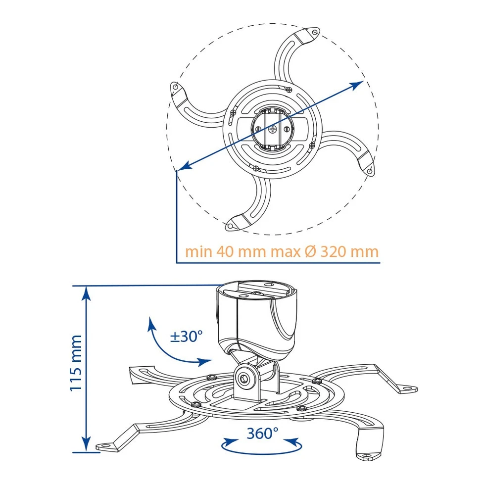• Универсальная система крепления для любого типа проектора с посадочными отверстиями от 40 мм до 320 мм