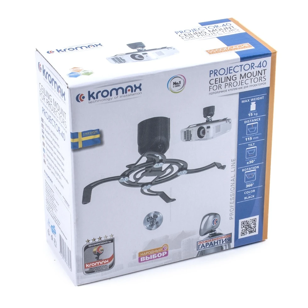 Потолочный кронштейн для проектора Kromax PROJECTOR-40. арт 9106. Это надежный потолочный кронштейн для видео проекторов с удобной регулировкой наклона и поворота. Расстояние от потолка до проектора 115 мм. Максимальная нагрузка на крепление - 15 кг. Универсальный потолочный кронштейн Projector-40 подходит для большинства видеопроекторов.