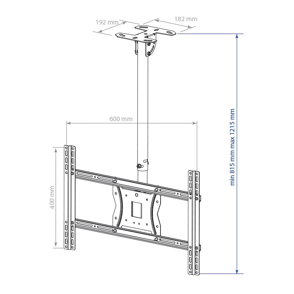 Потолочный кронштейн Kromax COBRA-4. арт 9089 имеет возможность крепления к наклонному потолку. Регулируемое расстояние от потолка min 815 mm max 1215 mm. Надежная стальная конструкция максимальная нагрузка до 65 кг. Кабель-канал. Универсальная система крепления для любого телевизора с посадочными отверстиями от 100 до 600 mm по горизонтали и от 100 до 400 mm по вертикали .Максимальная степень подвижности телевизор можно поворачивать на 240° и наклонять на -5° +10°. Легкая регулировка