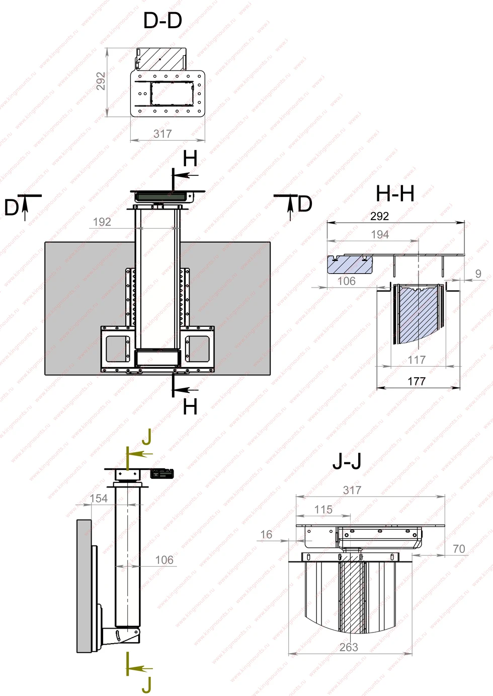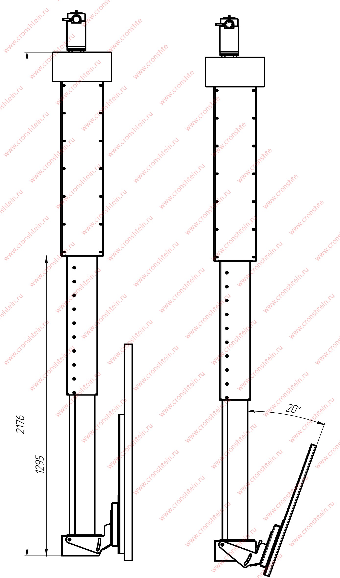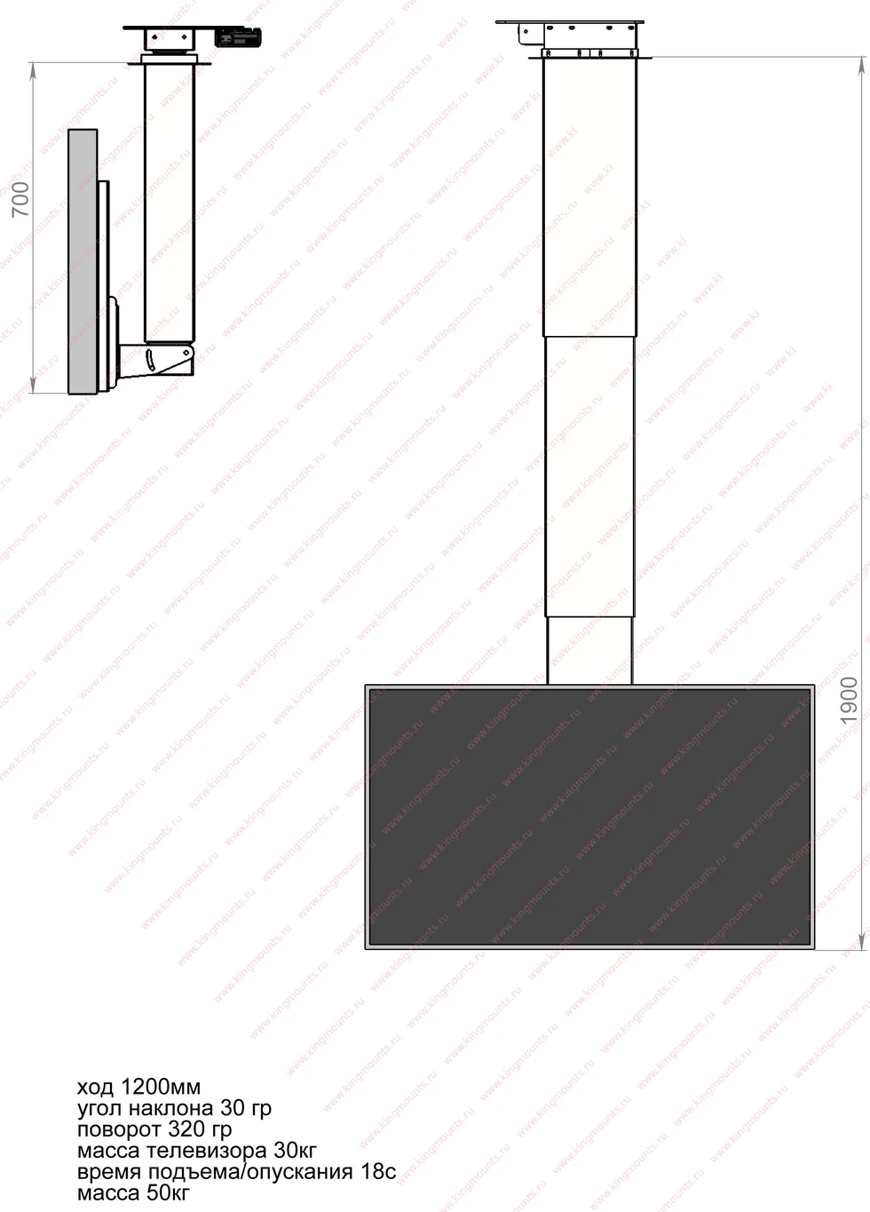 Стандарт крепления vesa: 200x200-600x400 мм. Размеры крепёжной пластины к потолку: 192х 317 мм. Размеры необходимого пространства ниши для монтажа: 292х317х100 мм. + 20 мм по краям для возможности монтажа. Размеры Колонны лифта в собранном состоянии: 210х110х700 мм. Расстояние до тв от лифта: а) 154 мм. при угле наклона 30 градусов. б) 70 мм При угле наклона 15 градусов Управление: Кнопка сухого контакта, Пульт ДУ с возможностью обучения пульта от телевизора, Через смартфон по WiFi и приложение на iOS, ANDROID (опция) Срок изготовления: 1 мес. Срок изготовления по тз заказчика(опция): от 2 месяцев
