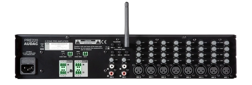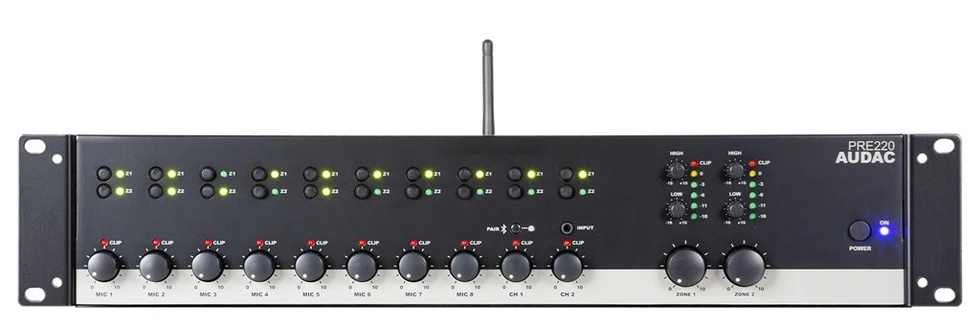 Предусилитель-стереомикшер 10:2 с Bluetooth, ползунковые регуляторы уровней. Вх: 8х XLR (48 В), 2x (2xRCA), 1x miniJack 3,5 мм. Вых: 2 зоны с балансным стерео (Phoenix 3-pin).