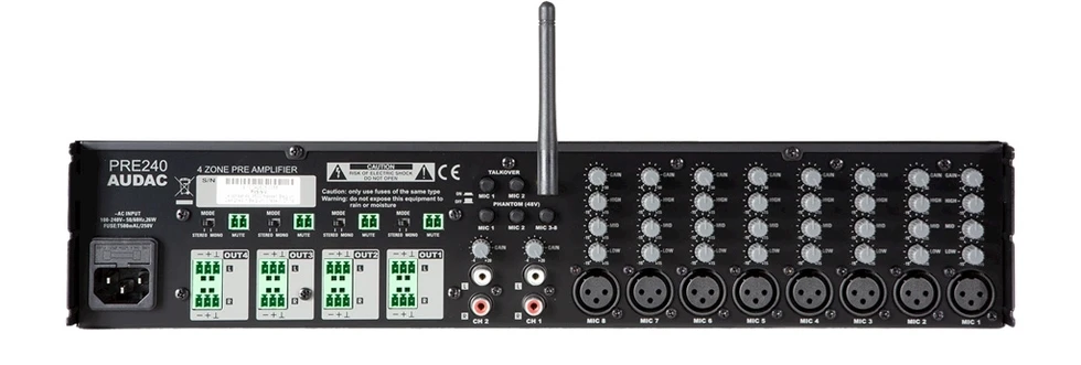 Предусилитель-стереомикшер 10:4 с Bluetooth, ползунковые регуляторы уровней. Вх: 8х XLR (48 В), 2x (2xRCA), 1x miniJack 3,5 мм. Вых: 4 зоны с балансным стерео (Phoenix 3-pin).