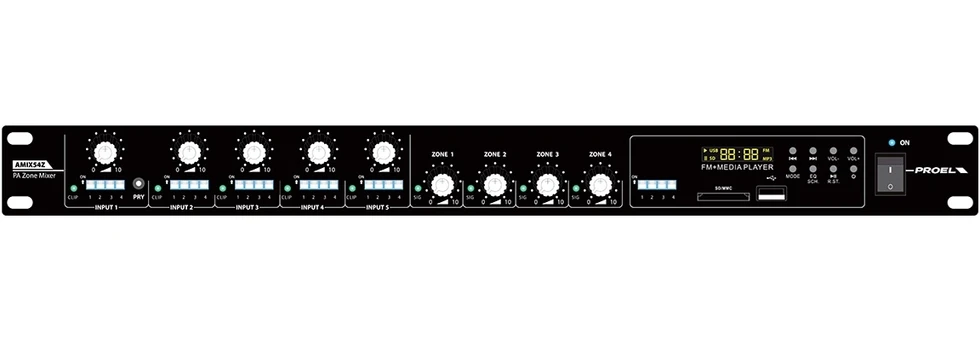 Предварительный стереоусилитель-микшер 5:4 с SD MMC/USB и FM-тюнером, Входы 5 Mic/Line (2хRCA + XLR/Jack 6,3 мм) с фантомным питанием 18 В. Выход стереоаудио (2хPhoenix) и на наушники. Монтаж в стойку.